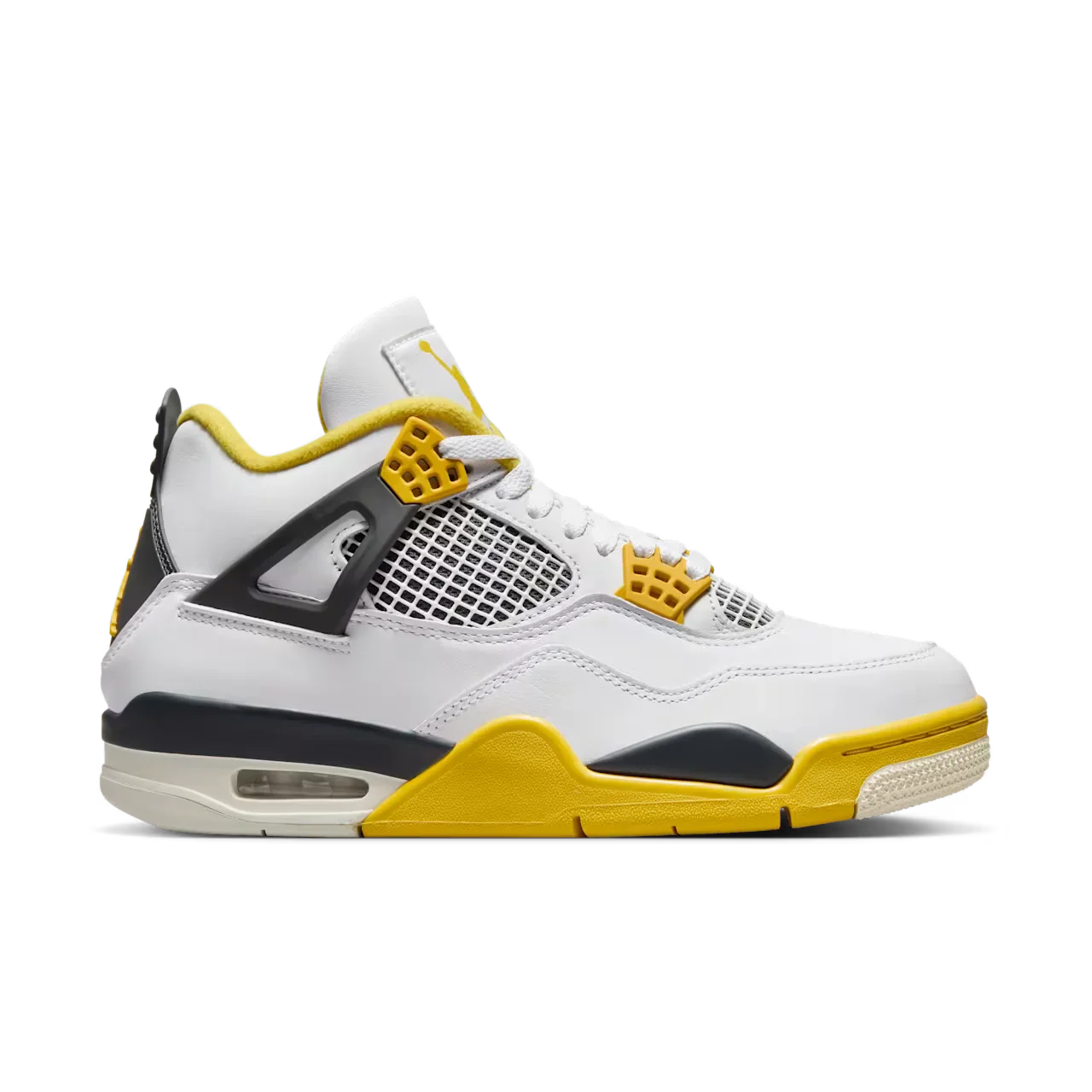 See mudel tõstab Air Jordan 4 silueti uuele tasemele, ühendades puhta valge naha ja erksa väävelkollase detailid. Kontrastsed silmused ja välistald loovad pilkupüüdva tasakaalu, mida täiustavad hingav võrk ja tugev pahkluu tugi.